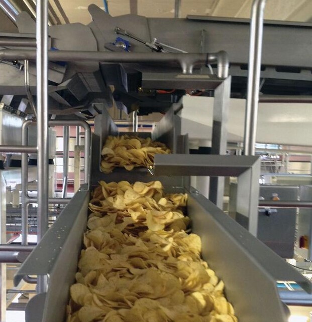 Conveyors transport the fried chips to the new packaging lines. A pneumatically controlled flap